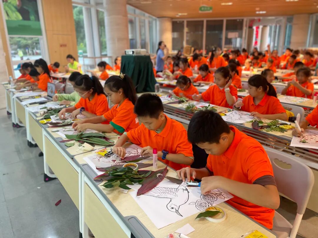 在昆虫馆研学教室内,孩子们参加“广西特色植物研学——鸟类植物贴画”手工实践课程利用园区准备的各类植物材料,精心制作出一幅幅富有创意的贴画作品。看着自己亲手制作的作品,孩子们心中充满成就感。