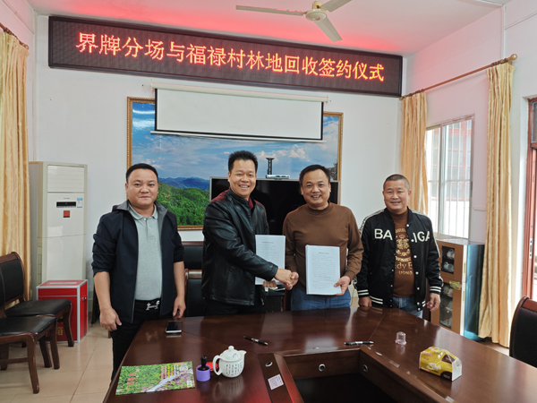 2025年11月3日,高峰林场界牌分场与兴宁区三塘镇福禄村举行被占地回收签约仪式成功收回17林班被占林地42亩。