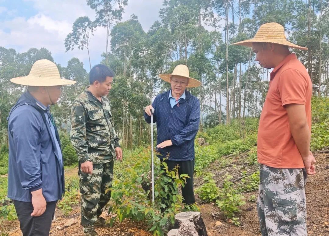 高峰林场副场长黄正根(右二)在陆川造林部查看新造林长势情况  张述彬摄