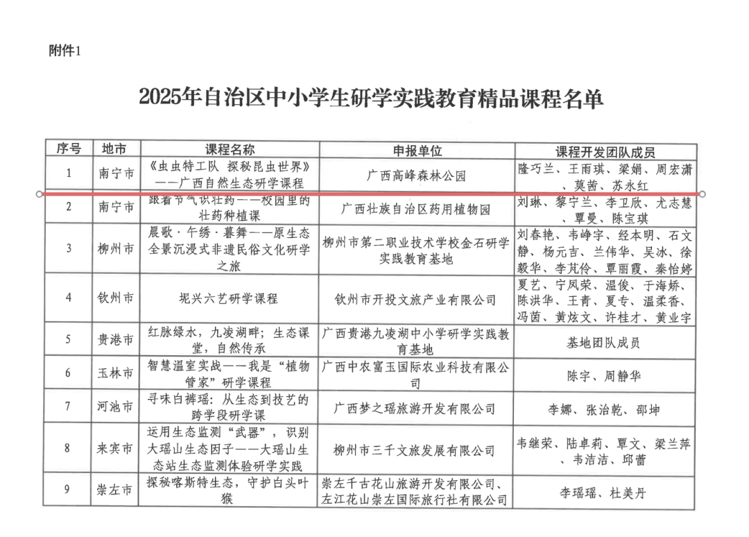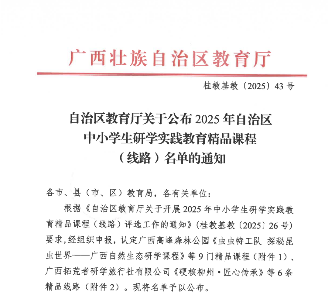 202614自治区教育厅获悉广西高峰森林公园研学团队自主研发的《虫虫特工队探秘昆虫世界——广西自然生态研学课程》,入选2025自治区中小学研学实践教育精品课程,是全区林业系统唯一入选课程。
