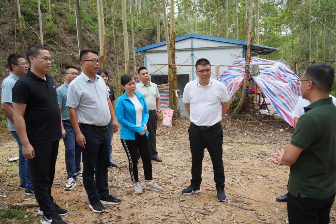 调研组实地考察南宁树木园在江门市的国储林建设情况。图右二为高峰林场场长李松海,前左三为高峰林场党委副书记、纪委书记陆艳武,前左二为高峰林场副场长魏国余,前左一为高峰林场副场长黄正根