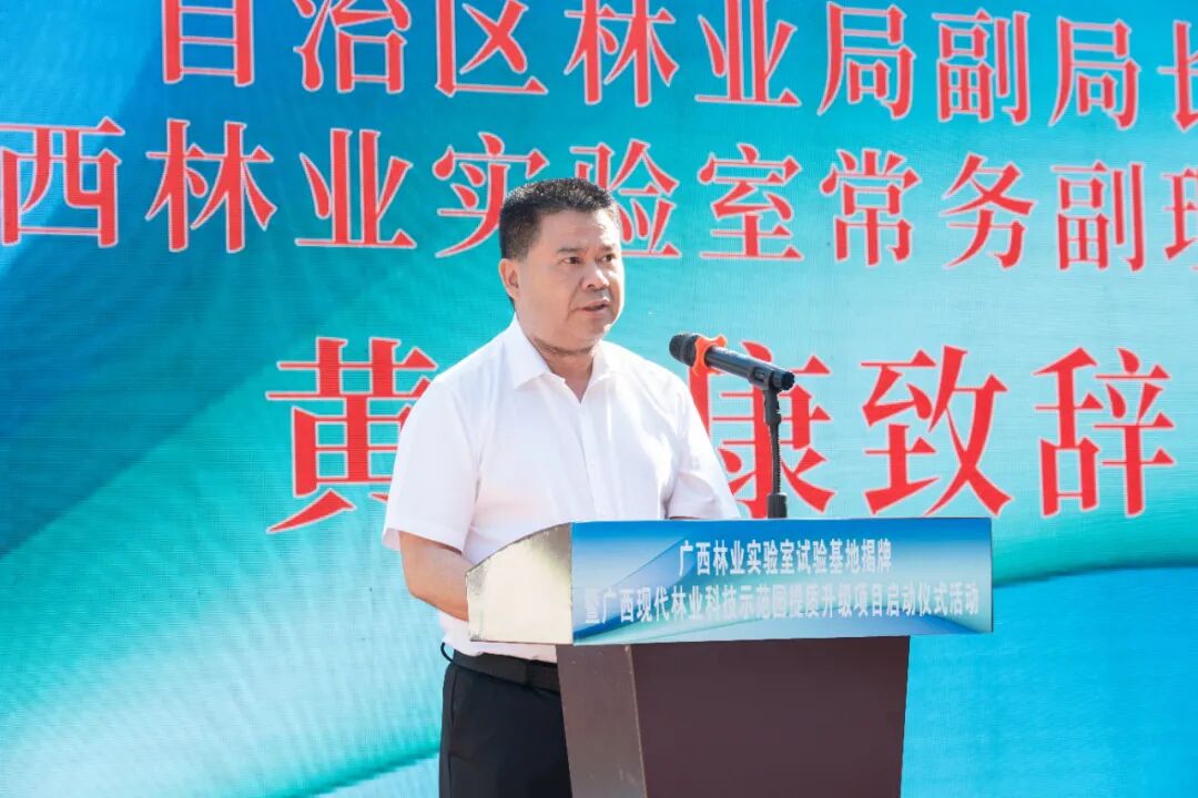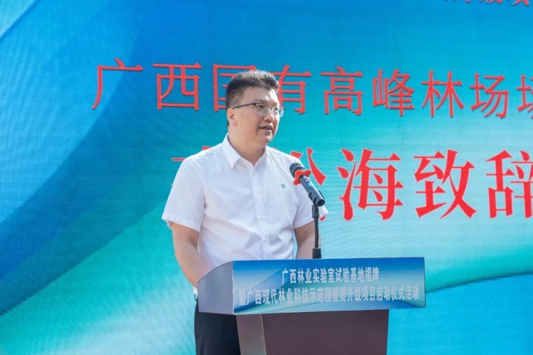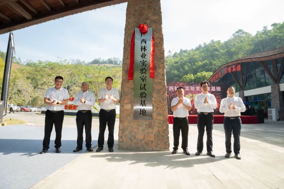 中国工程院院士、中南林业科技大学党委书记、广西林业实验室学术委员会副主任委员吴义强,自治区林业局副局长、广西林业实验室常务副理事长黄政康,广西大学副校长冯家勋,自治区林业局二级巡视员蒋桂雄,广西林业实验室执行主任、广西林科院院长李开祥,高峰林场场长李松海为广西林业实验室试验基地揭牌。黄政康宣布广西现代林业科技示范园提质升级项目正式启动。