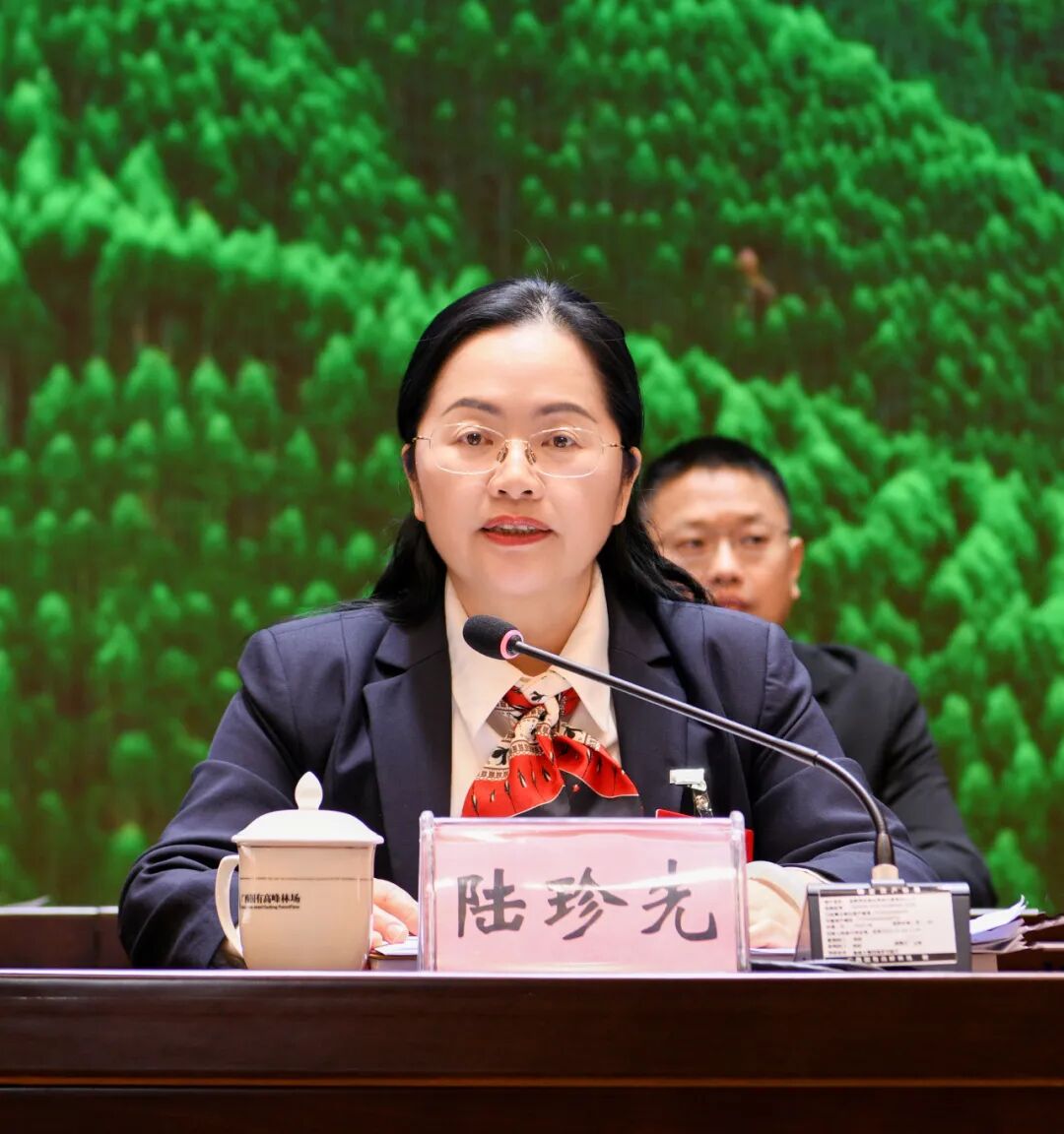高峰林场党委书记陆珍先在第二次全体会议中讲话。她强调,要坚定正确政治方向,坚持党建领航服务中心,牢固树立发展信心,把思想和行动统一到职代会的部署和要求上来,围绕“135”工作思路,狠抓各项改革举措落细落实,努力实现林场“生态美、基础强、资源优、产业兴、职工富”的高质量发展目标。