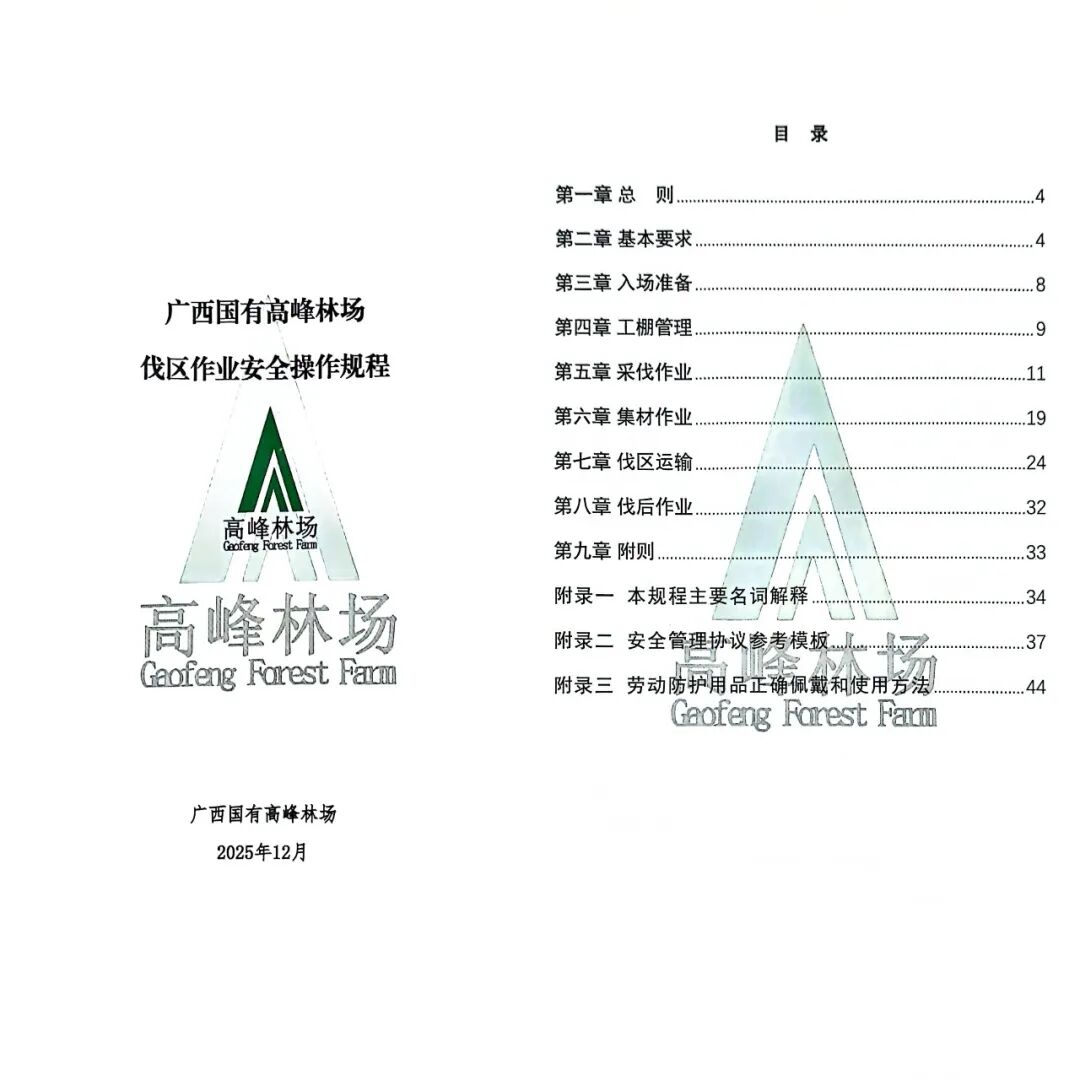 2026年1月20日,高峰林场已将自主系统编制的伐区作业安全操作规程手册,发放至各营林生产单位。此举,在广西区直国有林场中尚属首例。