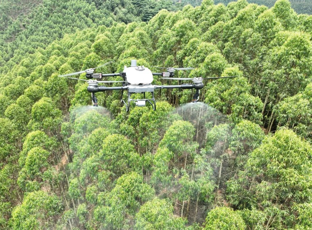 应用植保无人机开展桉树叶斑病防治作业。张程粼 摄