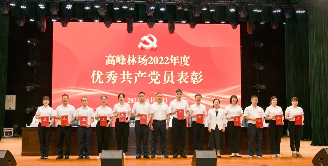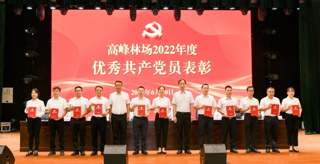 高峰林场党委书记陆珍先(左五)、高峰林场副场长黄正根(右六)为获得2022年度优秀共产党员颁奖