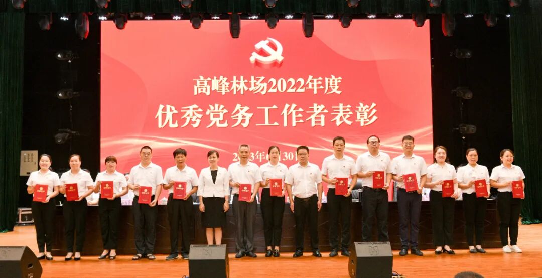 高峰林场党委副书记、纪委书记陆艳武(左六),高峰林场常务副场长朱兵(右七)为获得2022年度优秀党务工作者颁奖