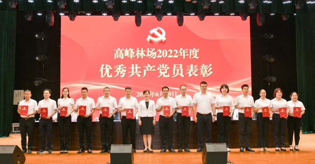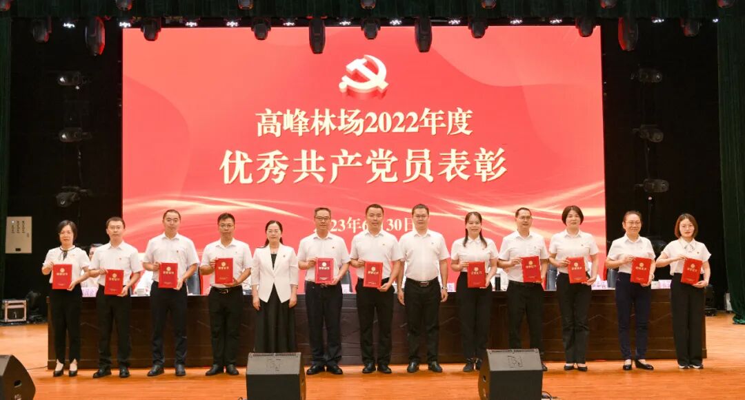 高峰林场场长、党委副书记李松海(右六),高峰林场党委副书记、纪委书记陆艳武(左七)为获得2022年度优秀共产党员颁奖