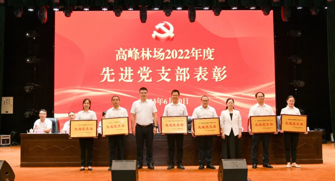 高峰林场党委书记陆珍先(前右三),高峰林场场长、党委副书记李松海(前左三)为获得2022年度先进党支部颁奖