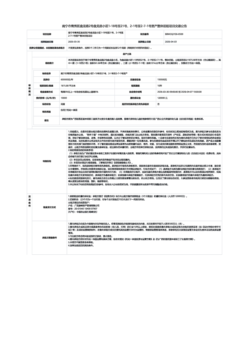 南宁市青秀区盘龙路2号盘龙居小区1-18号至21号、2-1号至2-7-1号资产整体招租项目