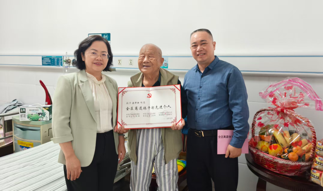 202510月28日,在“九九”重阳节即将到来之际,自治区林业局离退处二级主任科员刘超、高峰林场党委书记陆珍先专程前往医院探望98岁高龄的林场离休老党员梁华轩同志,并将“全区离退休干部先进个人”荣誉证书送到老人手中,向这位有着77年党龄的老党员致以热烈祝贺和诚挚问候,送去组织的温暖与关怀